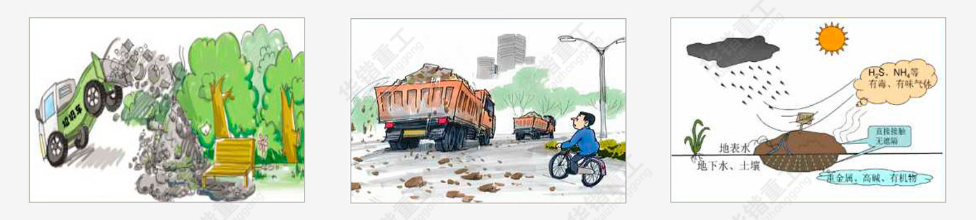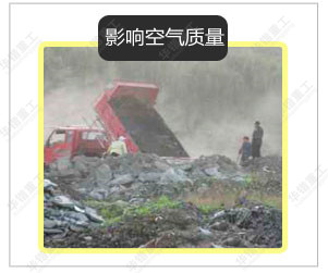 大多數(shù)城市建筑垃圾堆放地的選址在很大程度上具有隨意性,留下不少安全隱患。在外界因素的影響下,堆出現(xiàn)崩塌,阻礙道路甚至沖向其他建筑物的現(xiàn)象時(shí)有發(fā)生。 | 建筑垃圾在堆放和填埋過(guò)程中,由于發(fā)酵和雨水的淋溶、沖刷,以及地表水和地下水的浸泡而滲濾出的污水——滲濾液或淋濾液,造成周圍地表水和地下水的嚴(yán)重污染。 | 隨著城市的不斷發(fā)展,大量的建筑垃圾隨意堆放,不僅占用土地,而且污染環(huán)境,并且直接或間接的影響空氣質(zhì)量。 | 隨著城市建筑垃圾量的增加,垃圾堆放點(diǎn)也在增加,而垃圾堆放場(chǎng)的面積也在逐漸擴(kuò)大。 |